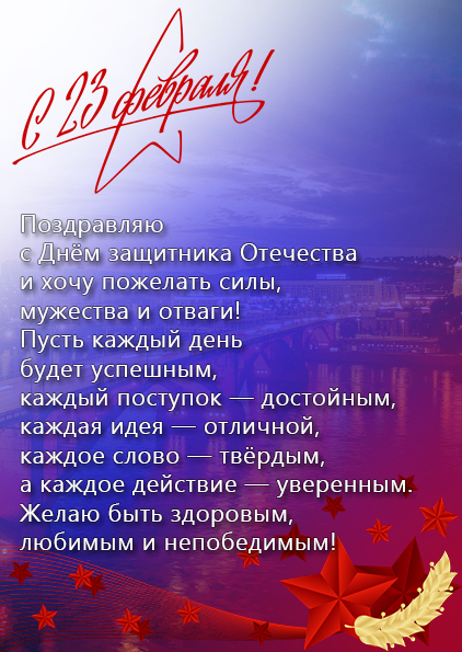 Уважаемые коллеги, сильная, мужественная основа нашего коллектива! С праздником вас, с Днем защитника Отечества! Пусть здоровье ваше будет крепким, а любовь близких людей искренней и прочной. Пусть вас радуют успехи и достижения, а фортуна поворачивается лицом и приносит удачу! Творческого вдохновения, стабильности, надежности!